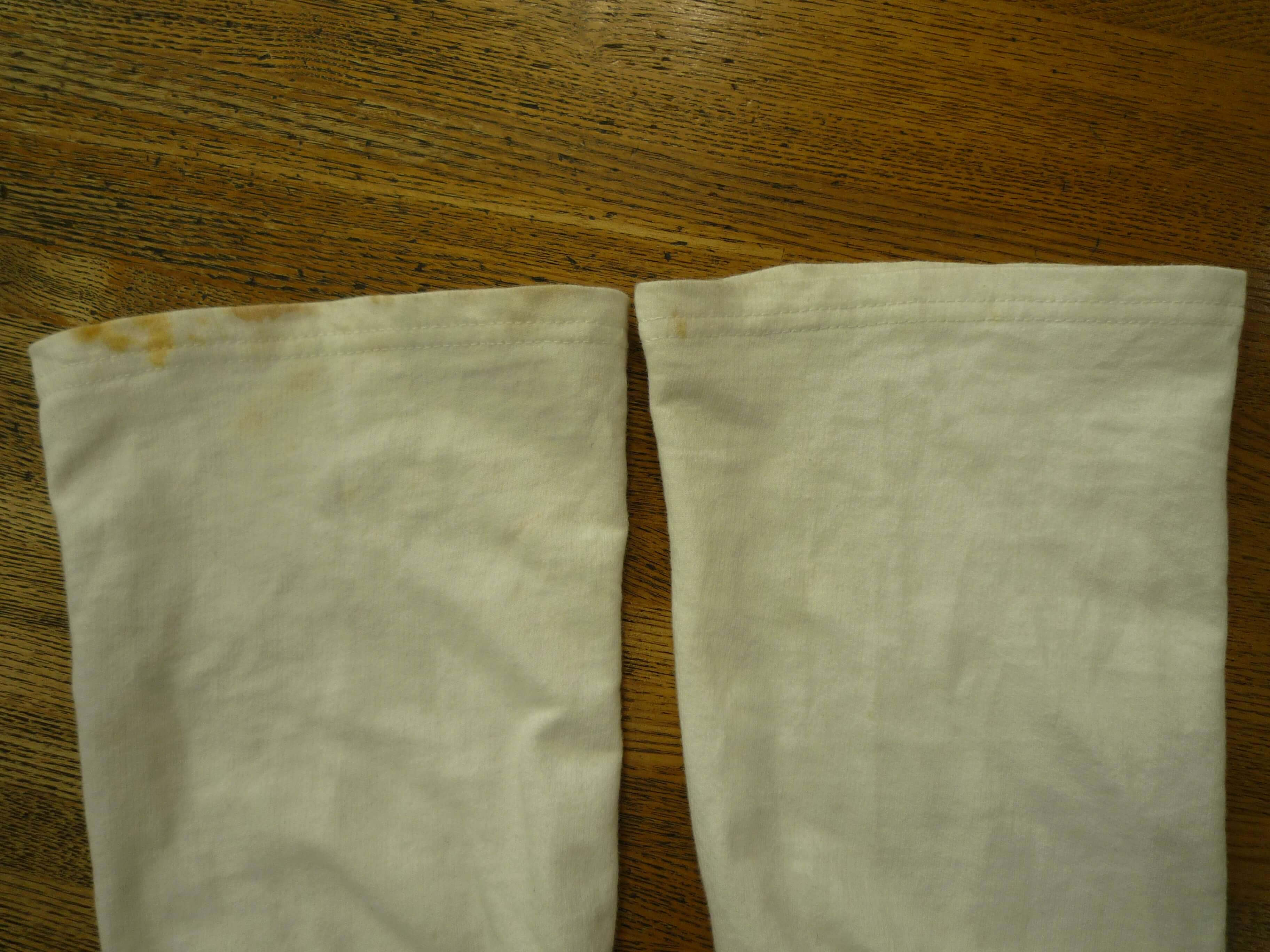 通常水洗いクリーニングの後、浴中漂白でしみ抜きします。温度と濃度に気を使いながら時間をかけてしみ抜きしました。綺麗に戻すことができました。