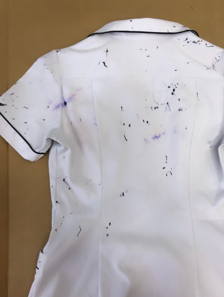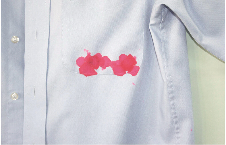 ワイシャツのポケットの中に赤ボールペンが入っていました。それを気づかずにご家庭にて洗濯。インクが広がってしまいました。