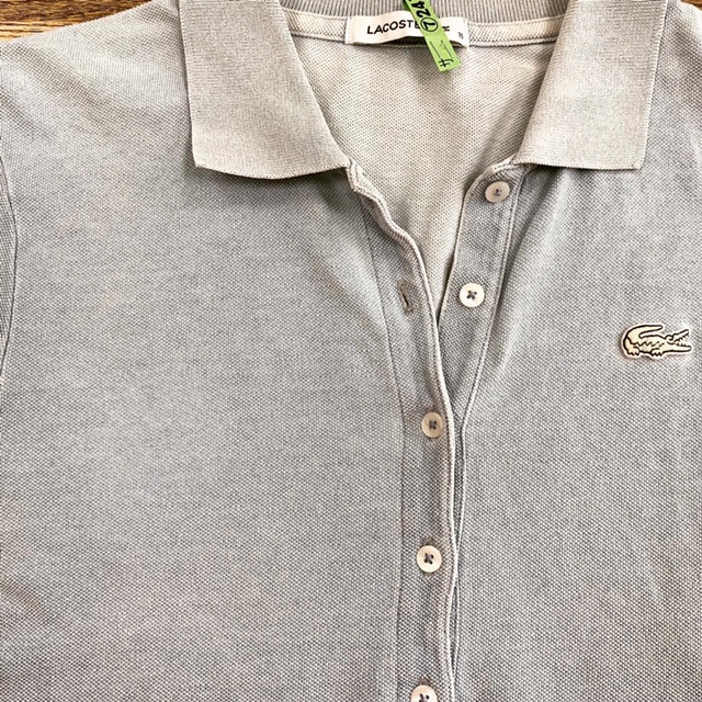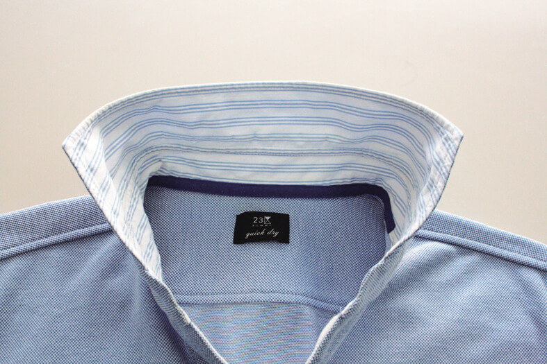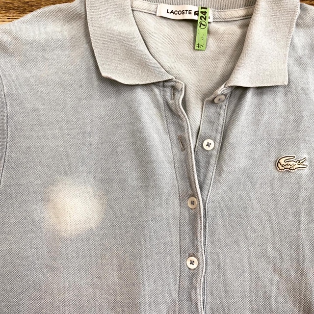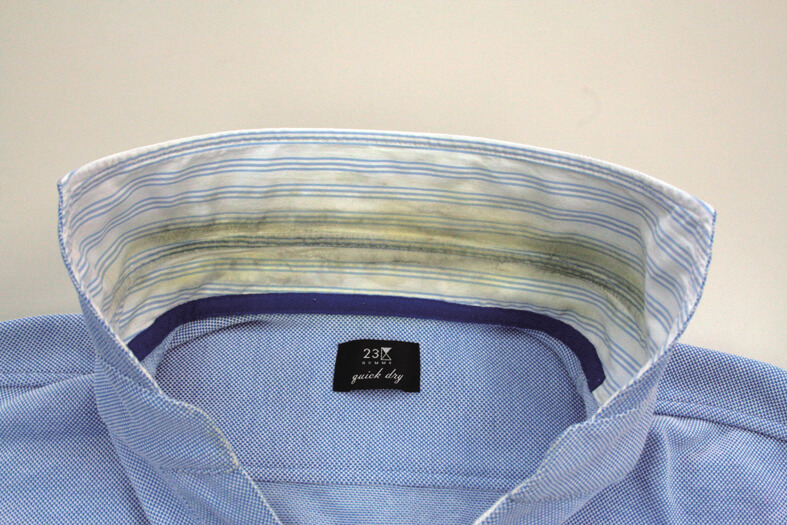 ポロシャツの襟の汚れです。襟首、袖口等はどうしても汚れが付きやすいものです。こまめなお洗濯が大切です。写真はかなりの期間、洗濯せずに放置されていたものと思われます。