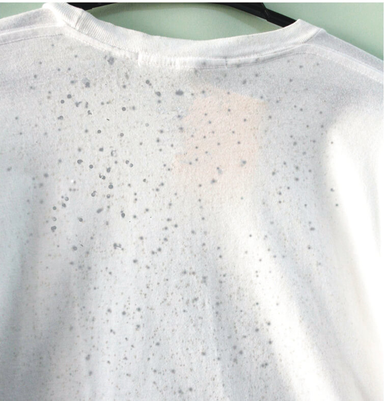 十分な乾燥せずに仕舞われたシャツです。湿気や水分が残ったままだと、その衣類はカビの温床となります。全体的に付着していました。