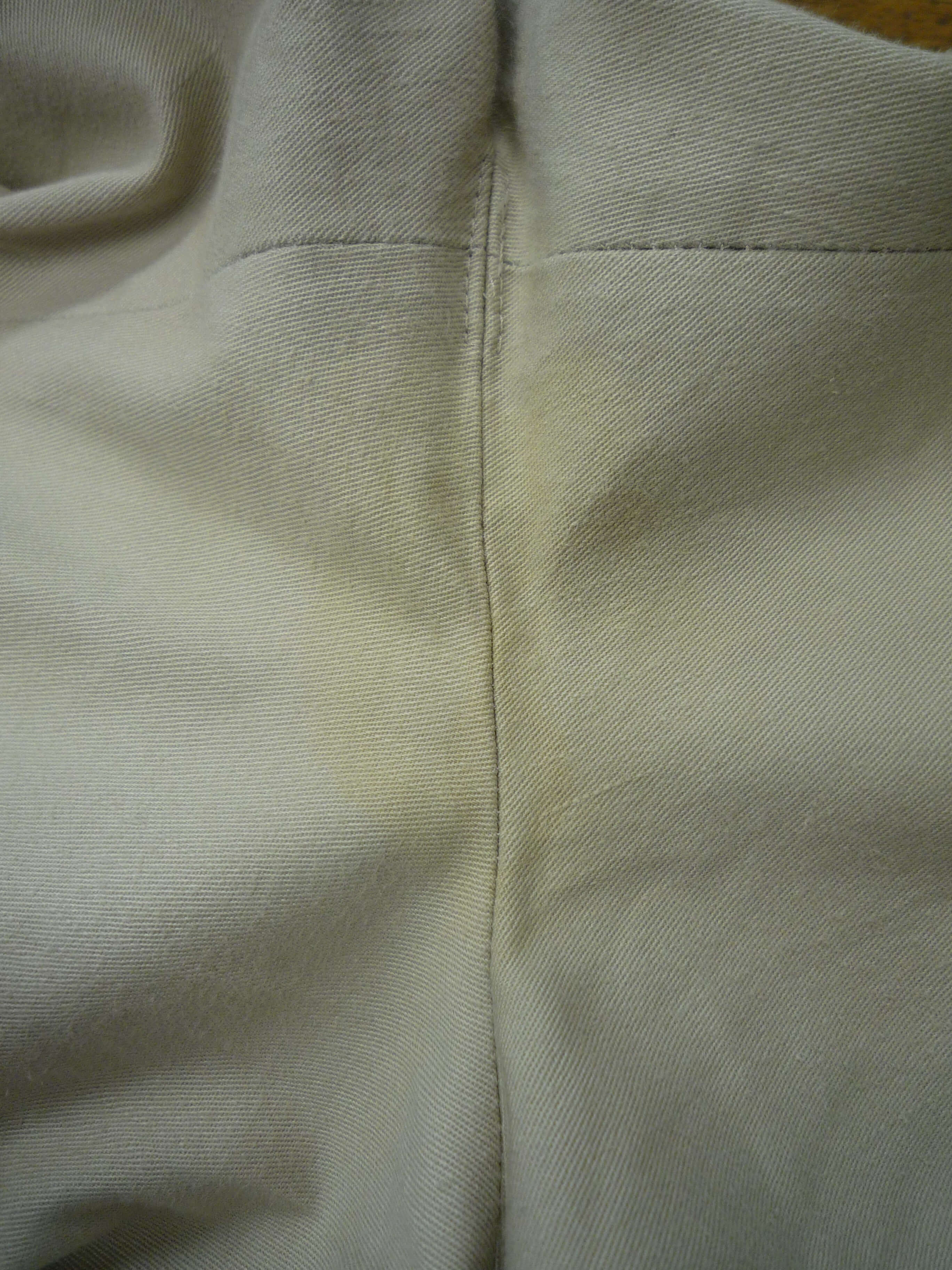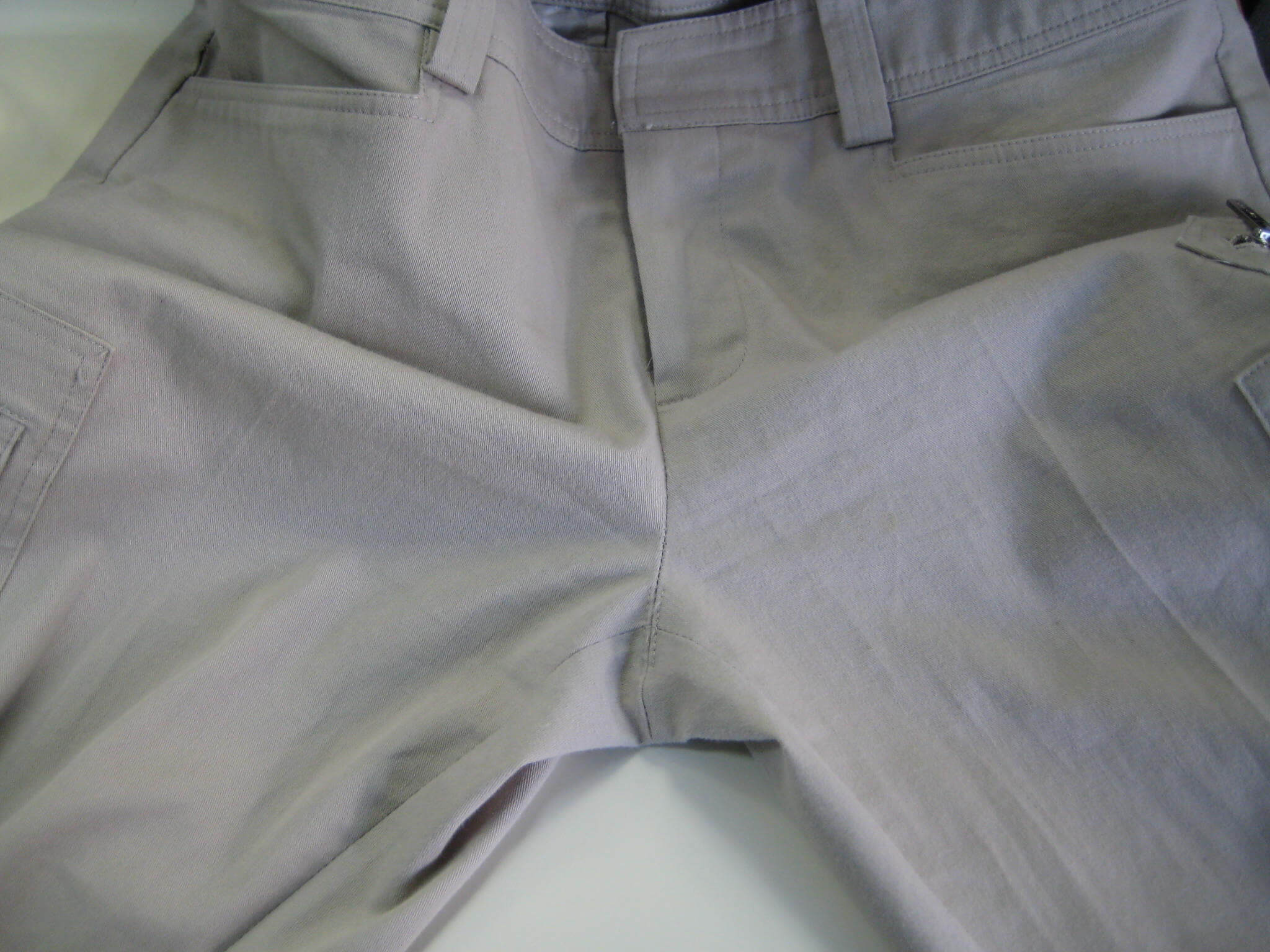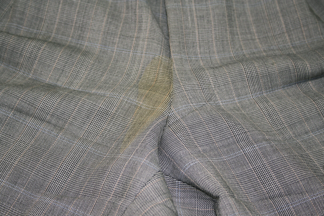 スラックスの又部分のシミです。残尿したお小水が時間とともにシミになって現れてきました。ファスナーの滑りも悪くなります。何より恥ずかしい感じですね。