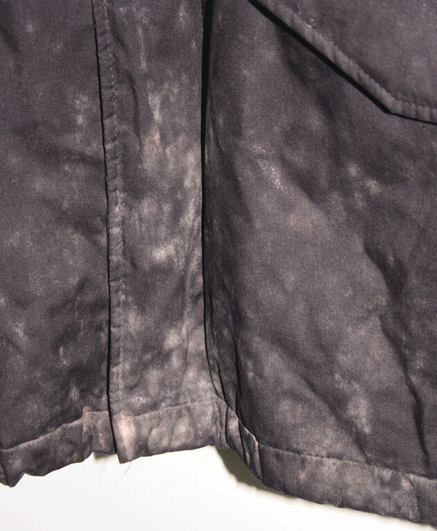 何らかの薬品(粉塵、スプレー系)と他店でのドライクリーニングによる化学変化による色抜けです。まだらに色が抜けていました。