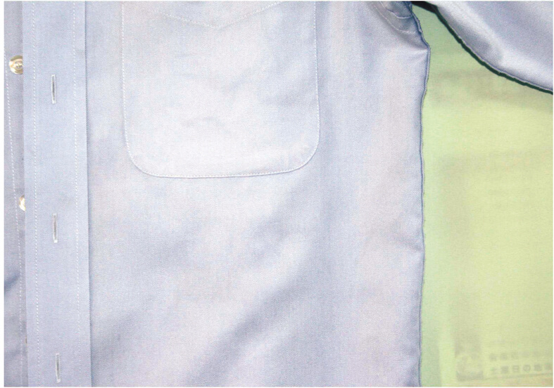 脇の汗じみです。一見、きれいな状態と思っていても生地に汗の成分が付着していると時間とともに浮き出てくるタイプのシミです。酸化発色された黄ばみです。油性、水性処理を施した後、入念に部分漂白をしてきれいに落ちました。