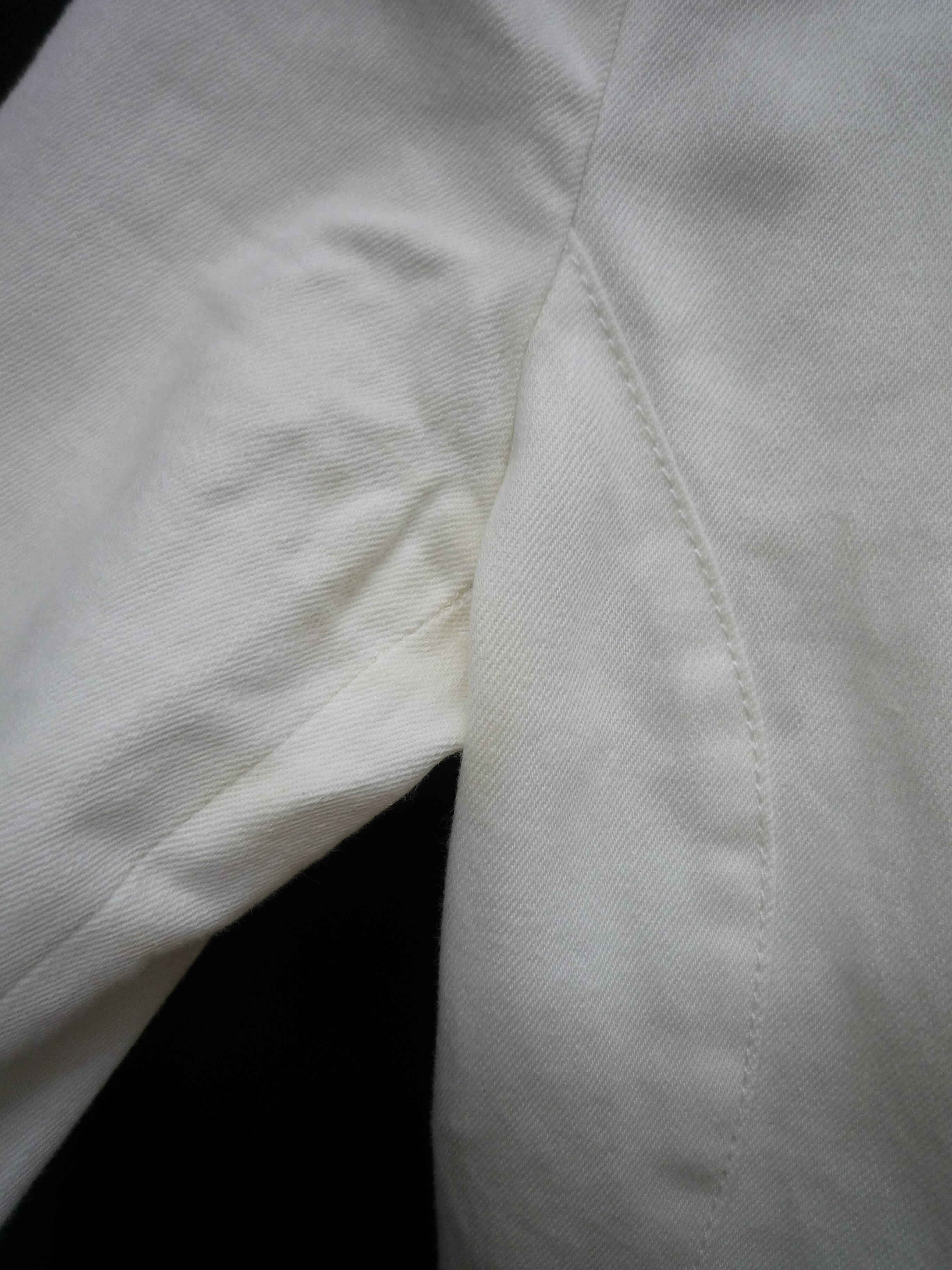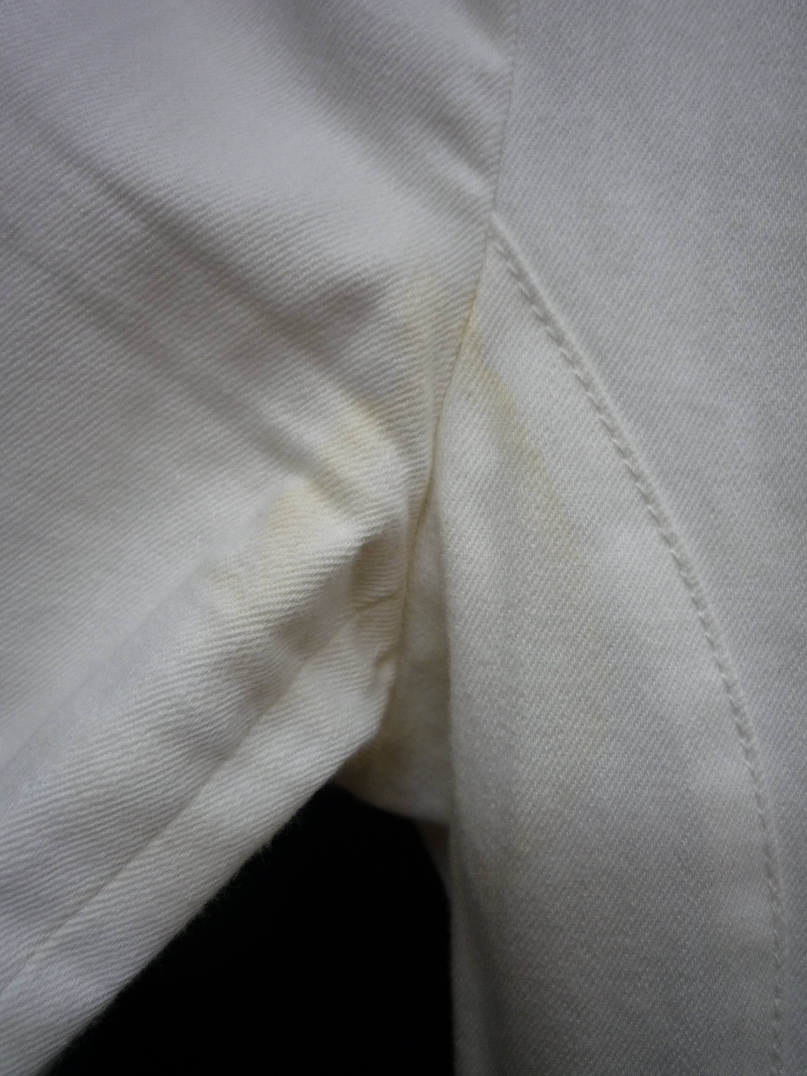 仕舞う前は黄ばんでいませんでしたが、1年後着用しようと出してみたら脇に黄ばみが出ていました。酸化発色です。